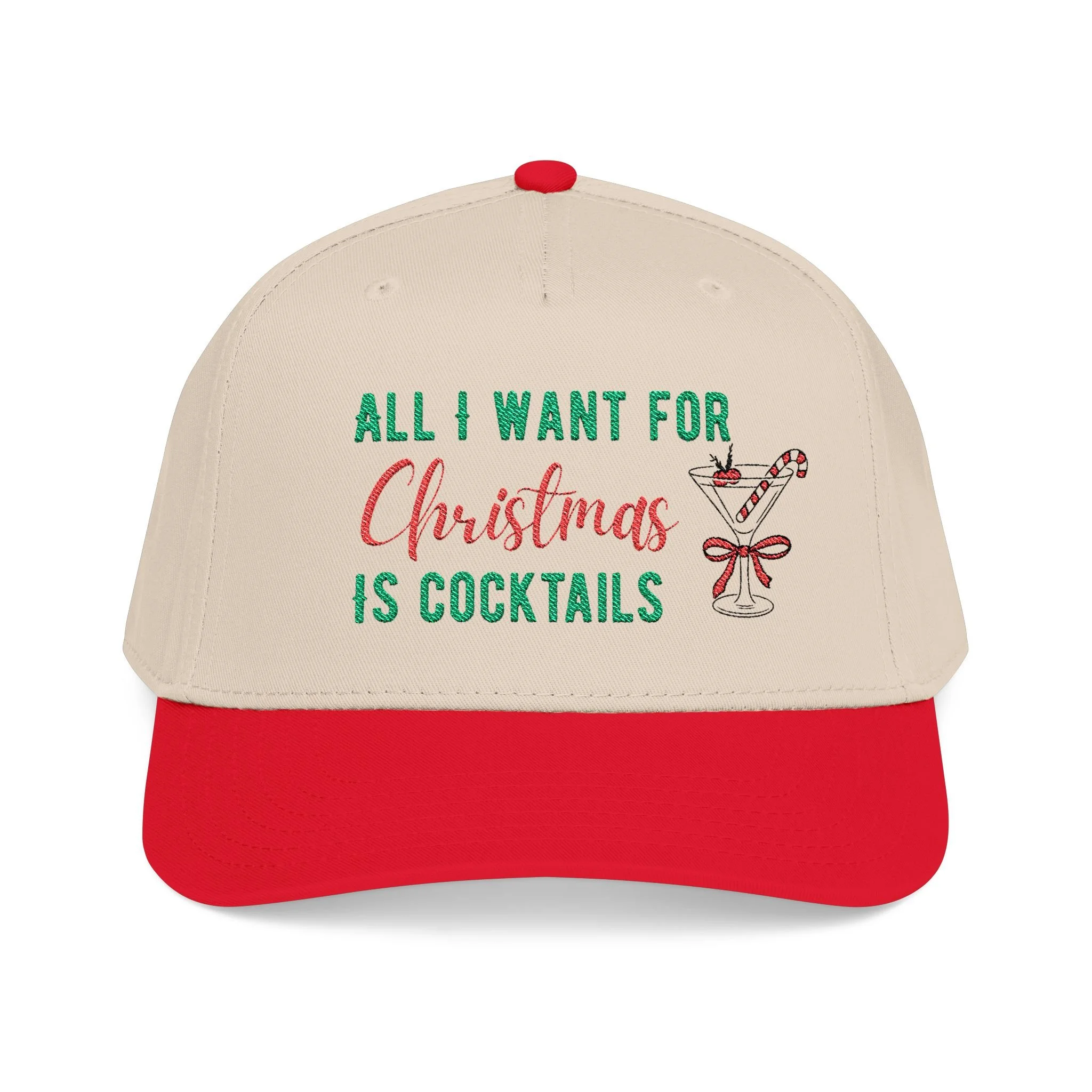 This mid-profile baseball cap brings a festive flair to your wardrobe, perfect for those who love to celebrate in style. With its playful "All I Want for Christmas is Cocktails" embroidered design, it radiates joy and holiday spirit. Ideal for Christmas parties, family gatherings, or lounging by the fire, this cap fits seamlessly into your festive celebrations.